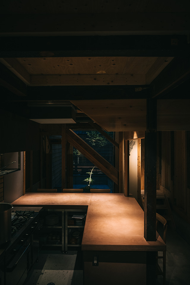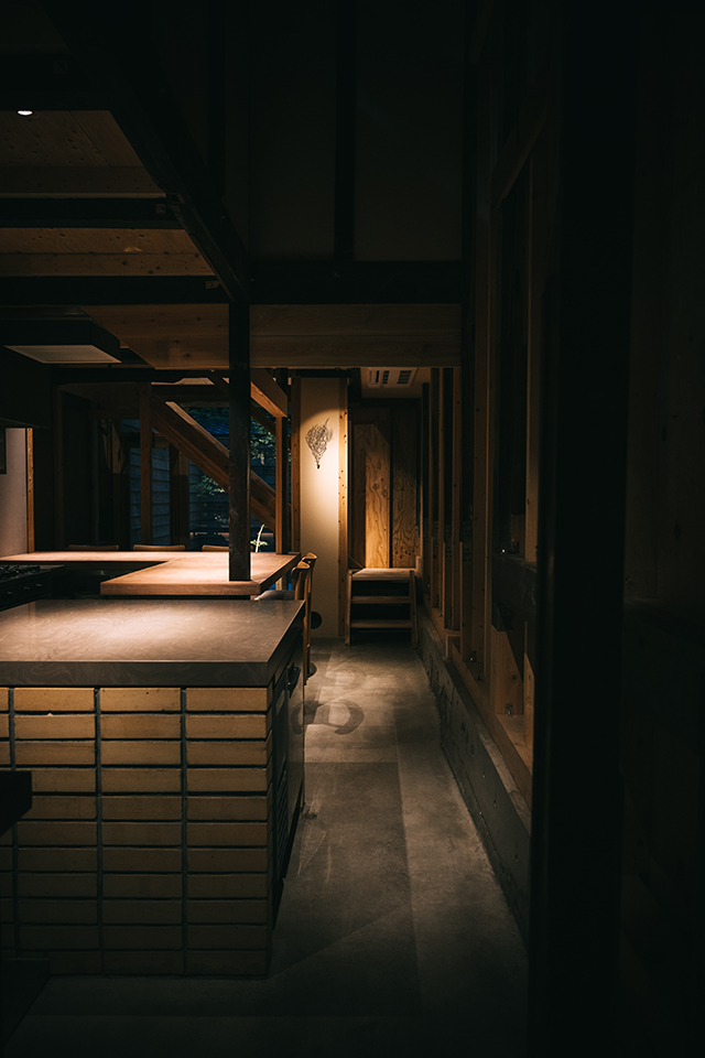 京町家の歴史の痕跡を残しつつ、傾きを補強した東壁の下地がそのまま露出し、未完成の余白を残したその空間は、過度な緊張感を与えず、ここからの進化を感じさせてくれる。