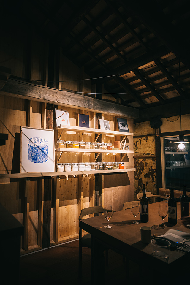 土やレンガ、木などの自然素材が使われ、カウンターは左官屋さんが仕立ててくれた。厨房と客席が融合した小空間は、臨場感があり、シェフとゲストの距離が近い。店内はオーセンティックな雰囲気に包まれる。薪ストーブで調理する出来立ての料理、京町家、シェフのバランスがとれたレストランであり、来店されるお客様の出会いによって、この場所は進化していく。